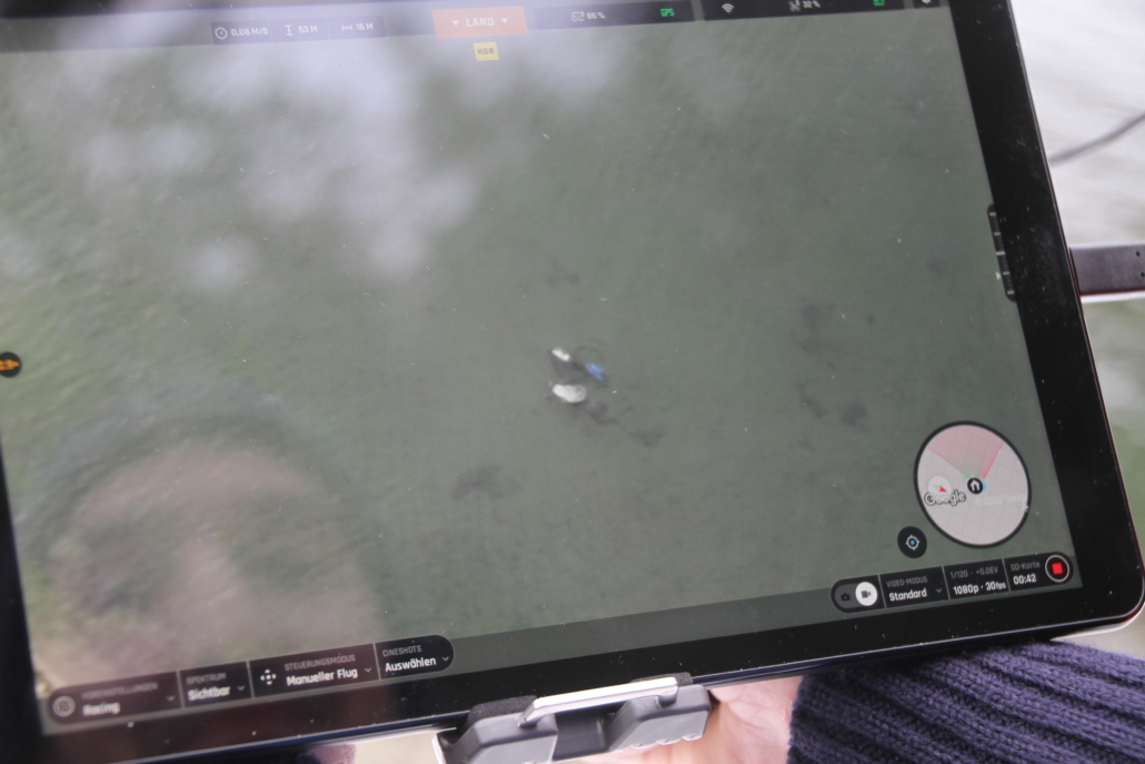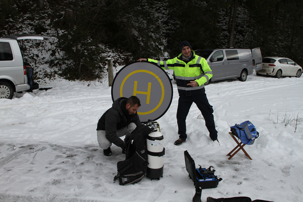 Mit zwei Tauchern suchten wir die Drohne im gesamten Gewässer. Bei 2 Grad Wassertemperatur und guter Sicht begann die Suche. Leider lag sie schon ca. 2 Monate im Speichersee. Vor ein paar Wochen wurde das Becken mit viel Wasser gefüllt und die Drohne durch die Strömung aus dem See gespült. Wir fanden sie leider nicht mehr. Wären wir kurz nach dem Absturz gekommen, hätten wir sie mit Sicherheit gefunden. Aber die Natur hat uns in diesem Fall einen Strich durch die Rechnung gemacht.